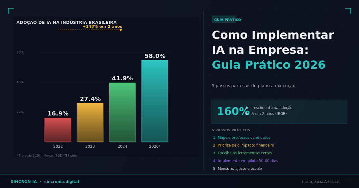 Saiba como implementar IA na empresa com 5 passos práticos e dados reais: adoção de IA cresceu 160% na indústria brasileira. Reduza custos em até 50%.
