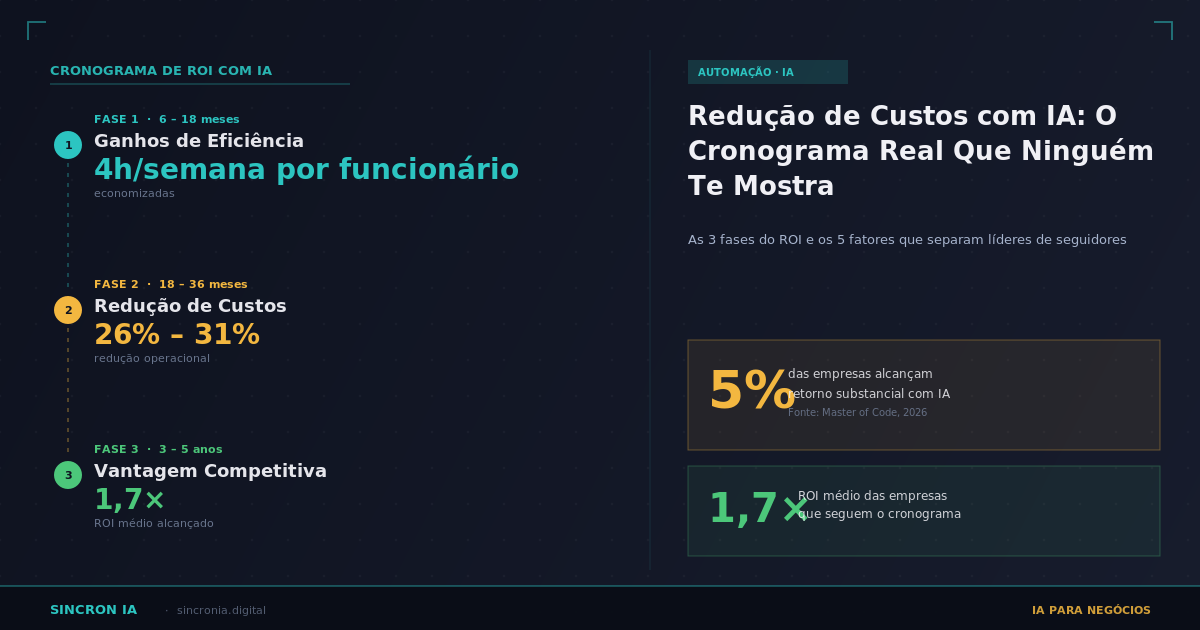 Resumo: Descubra as 3 fases do ROI com IA e os 5 fatores que separam empresas líderes das demais. Guia prático com cronograma real de redução de custos.